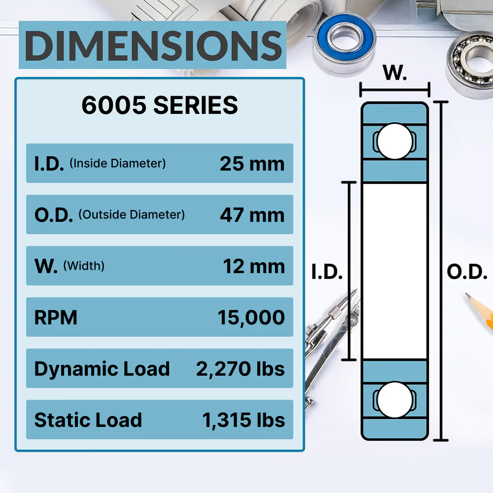 | MODEL | 6005-2RS | IN DIAMETER (BORE) | 25 mm |