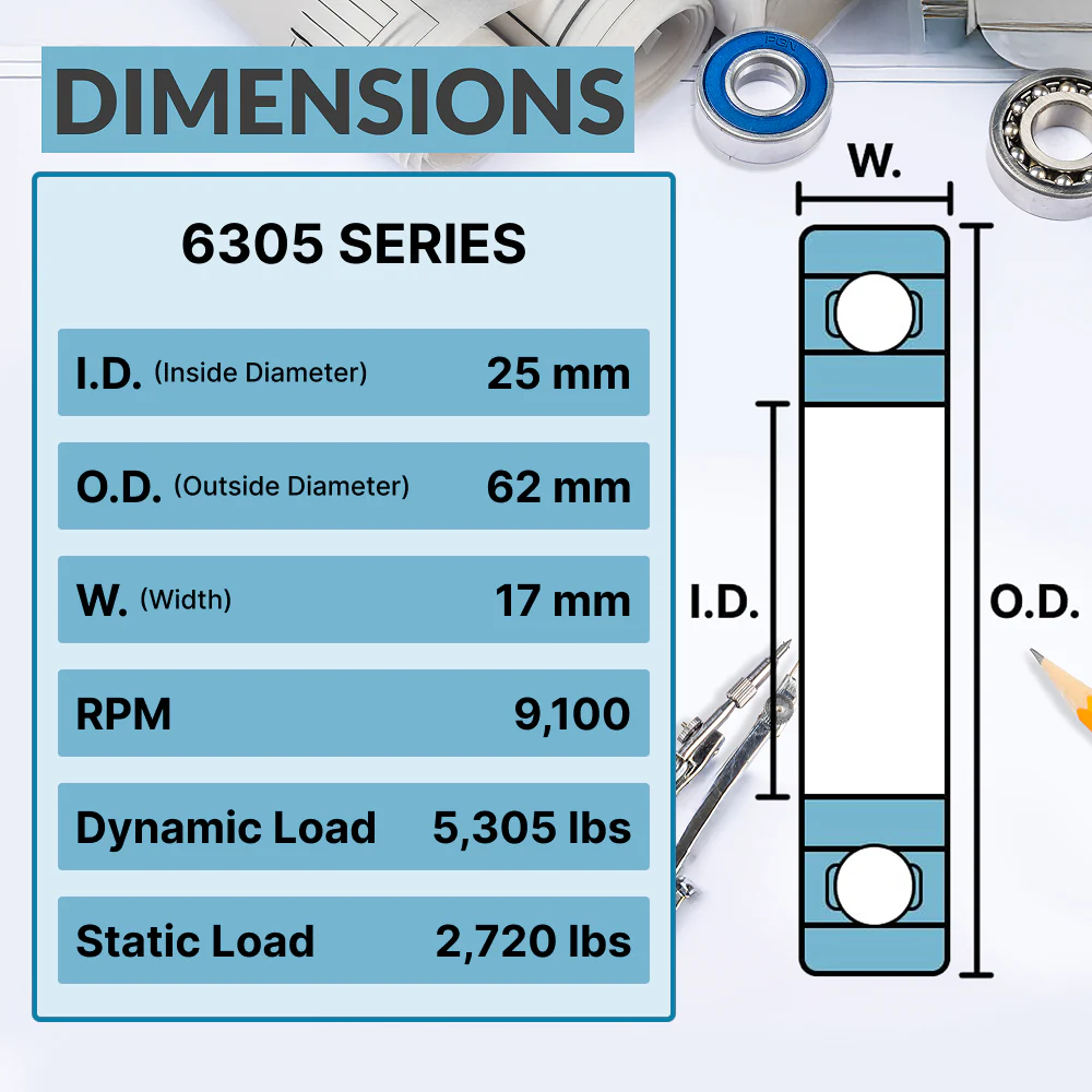 | MODEL | 6305-2RS | IN DIAMETER (BORE) | 25 mm |